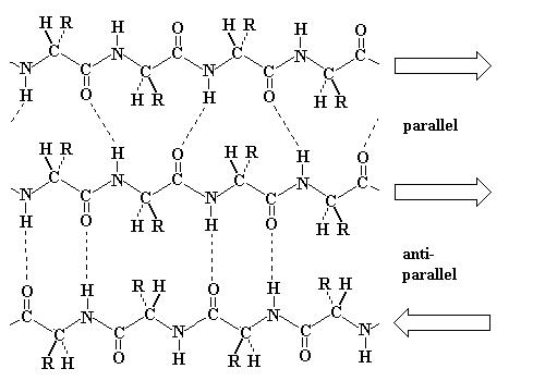 Estructura en zigzag, éstas se unen mediante enlaces de hidrógeno intercatenarios. Todos los enlaces peptídicos participan en estos enlaces cruzados, lo que la hace muy estable. Está formada por dos o más cadenas polipeptídicas paralelas (en un mismo sentido) o antíparalelas (sentidos opuestas) y se juntan por medio de puentes de hidrógeno y diversos arreglos entre los radicales libres de los aminoácidos. Esta conformación tiene una estructura laminar y plegada, a la manera de un acordeón.